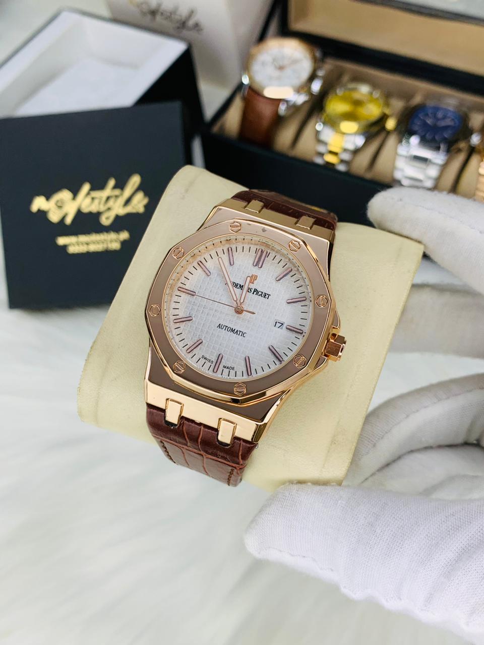 AP Royal Oak Self Winding – Premium Leather Straps (Brown belt white dail copper case)